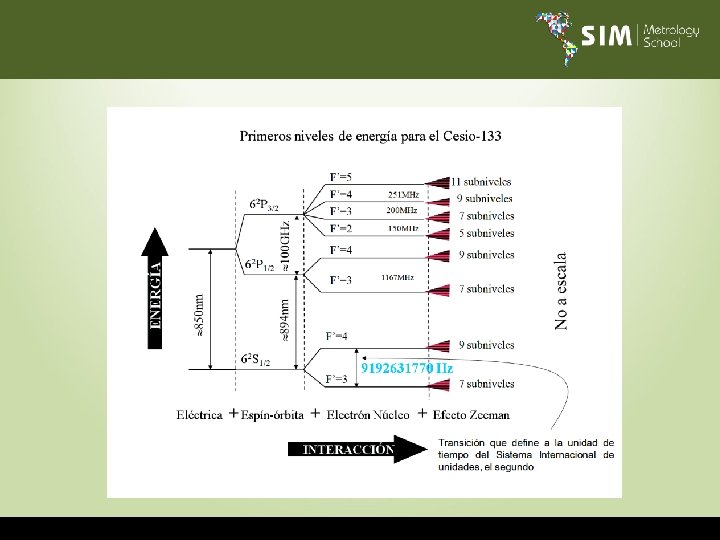 Definition of the unit of time, the second F’=3 200 MHz F’=2 150 MHz F’=4 F’=3 894 nm 62 S 11 subniveles 9 subniveles 7 subniveles 5 subniveles 9 subniveles 1167 MHz 7 subniveles F’=4 1/2 F’=3 Eléctrica + Espín-órbita 9 subniveles 9. 192631770 GHz 7 subniveles + Electrón Núcleo + Efecto Zeeman INTERACCION No a escala 251 MHz 1/2 850 nm ENERGIA 62 P 3/2 100 GHz 62 P F’=5 F’=4