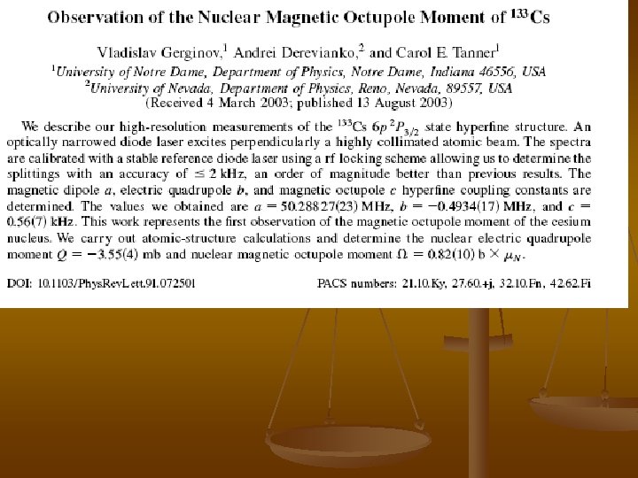 Evaluation -3 Since these one-electron matrix elements depend sensitively on the electronic wavefunctions near the nucleus, we really need their correct relativistic form Further topics – We need to learn how to solve the Dirac equation for the relativistic hydrogen atom. - Second part of the Schwartz paper evaluates these equations, and also generalizes the hyperfine interactions to 2 -electron systems, off-diagonal interactions (needed for some second order interaction cases). - For more information on irreducible tensor operators, see: -Ref. 1 – see Fischer et al, appendix (word version on Berry website) - http: //atoms. vuse. vanderbilt. edu/Elements/Comp. Meth/HF/node 24. html Ref. 2 – see Breinig - Rotations, spherical tensor operators and the Wigner. Eckart Theorem (word version on Berry website) at http: //electron 6. phys. utk. edu/qm 2/modules/m 4/wigner. htm Now we turn to the only measurement of the hyperfine structure due to an octupole moment.