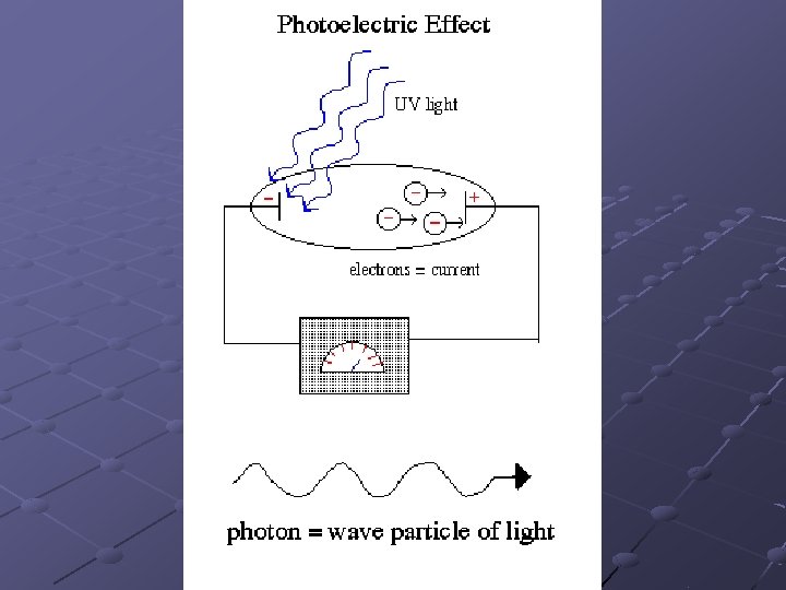 Einstein (prompted by Planck’s ideas) suggested that light comes in packets or quanta of energy called photons. Photons of red light contain less energy than photons of UV light If a high energy photon collides with an electron on a metal surface, the electron will gain the energy of the photon and have sufficient energy to leave the surface. Since this is a one electron – one photon event, having more low energy photons will not result in electron ejection (p. 172)