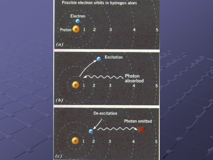 Spectroscopy Bright line spectra were observed for atoms rather than continuous spectra. Bohr’s explanation: n n If only certain quanta of light (photon energies) can be emitted from an atom then the energy of the electron must be quantized. That is: electrons can only occupy certain energy levels around the nucleus. They can never occupy intermediate energy levels.