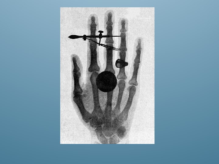 Wilhem Rontgen 1895 • Röntgen's name is chiefly associated with his discovery of the rays that he called X-rays. • He was studying the phenomena accompanying the passage of an electric current through a gas of extremely low pressure. • Previous work in this field had already been carried out by J. Plucker J. W. Hittorf C. F. Varley E. Goldstein, Sir William Crookes H. Hertz • Röntgen's work on cathode rays led him, however, to the discovery of a new and different kind of rays.