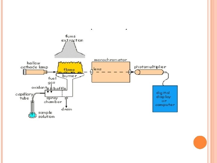 Sample solutions are usually aspirated and entering to the flame excitation by heat of flame absorb light from hallow cathode lamb to go from ground state E˳ to higher energy level E 1 monochromator detector measuring the reduction of intensity of light refer to conc of sample. • Each Element have specific E that will absorb a specific wavelength of light.