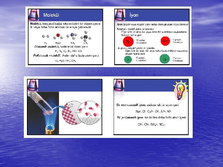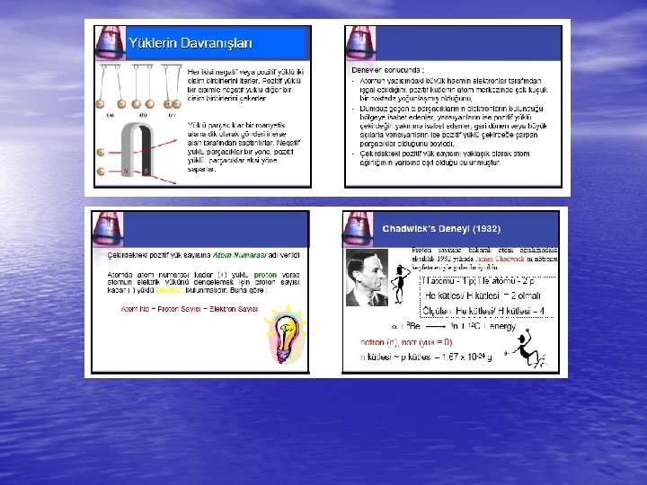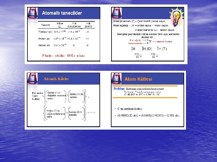 • Proton sayısı atomlar (elementler) için ayırt edici özelliktir. • Yani proton sayısının farklı olması elementin diğerinden farklı olduğu anlamına gelir. Elektronların bulunma olasılığının olduğu bölgelere elektron bulutu denir. Kimyasal olaylarda (reaksiyonlarda) yalnızca elektron sayısı değişir. Proton ve nötron, çekirdekte bulunduğu için sayıları değişmez. Nötr bir atom için; elektron sayısı= proton sayısı (A. N. ) Atom numarası= proton sayısı Çekirdek yükü= proton sayısı İyon yükü= proton sayısı – elektron sayısı (E. S. ) (K. N. ) Kütle numarası= proton + (N. S)nötron sayısı (Nükleon sayısı)(atom ağırlığı) Atom Numarası = Proton Sayısı = Çekirdek Yükü = Elektron Sayısı