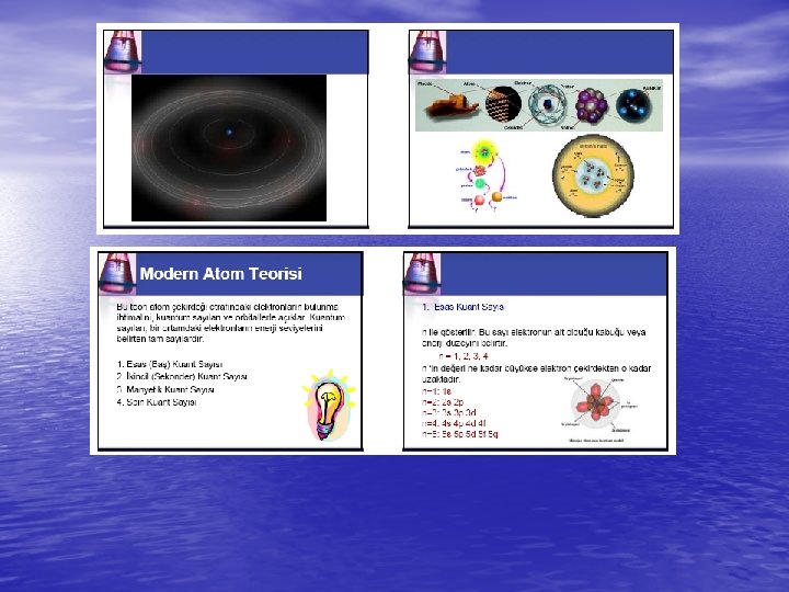 • Modern atom teorisini kısaca şu şekilde özetleyebiliriz: Atomda belirli bir enerji düzeyi vardır. Elektron ancak bu düzeyden birinde bulunabilir. Elektron bir enerji düzeyindeki hareketi sırasında çevreye ışık yaymazlar. Atoma iki düzey arasındaki fark kadar enerji verilirse elektron daha yüksek enerji düzeyine geçer Atoma verilen enerji kesilirse elektron enerjili düzeyinde kalamaz daha düşük enerji düzeyinden birine geçer. Bu sırada iki düzey arasındaki fark kadar enerjiyi ışık şekline çevreye verir