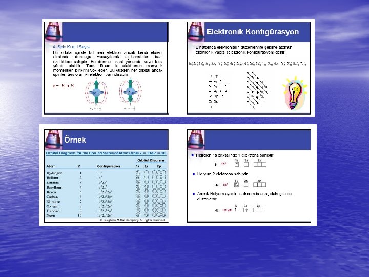 • Her hangi bir enerji seviyesinde elektron dairesel bir yörüngede (orbitalde) hareket eder. Bu yörüngelere enerji düzeyleri veya kabukları denir. Elektronlar kararlı hallerden birinde bulunurken atomdan ışık (radyasyon) yayılmaz. Ancak yüksek enerji düzeyinden daha düşük enerji düzeyine geçtiğinde, seviyeler arasındaki enerji farkına eşit bir ışık kuantı yayınlar. Bunlara E=h. ν bağıntısı geçerlidir. Elektron hareketinin mümkün olduğu kararlı seviyeler K, L, M, N, O gibi harflerle veya en düşük enerji düzeyi 1 olmak üzere her enerji düzeyi pozitif bir tam sayı ile belirlenir ve genel olarak “n” ile gösterilir. (n : 1, 2, 3, . . . ∞ )