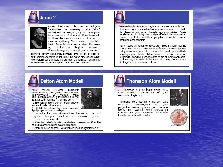 Atom Modelleri : • Bilim insanları çeşitli deneyler yapmışlar, atom • hakkında elde ettikleri bilgileri açıklamak için çeşitli bilimsel modeller ortaya koymuşlardır. Atom hakkında ortaya konan her yeni model bir önceki modelin eksikliğini gidermiştir. Atom hakkında yapılan yeni deneyleri açıklayamayan modelin yerine de yeni bir model geliştirilmiştir. Atom hakkında Democritus, Dalton, Thomson, Rutherford, Bohr ve De Broglie isimli bilim adamları ve filozoflar görüşlerini ortaya koymuşlar ve günümüzdeki atom modeli ortaya çıkmıştır. Günümüzde kullanılan atom modeli Modern Atom Teorisi sonucu ortaya konmuştur ve bugünkü model, yeni bir model bulununcaya kadar geçerliliğini sürdürecektir.