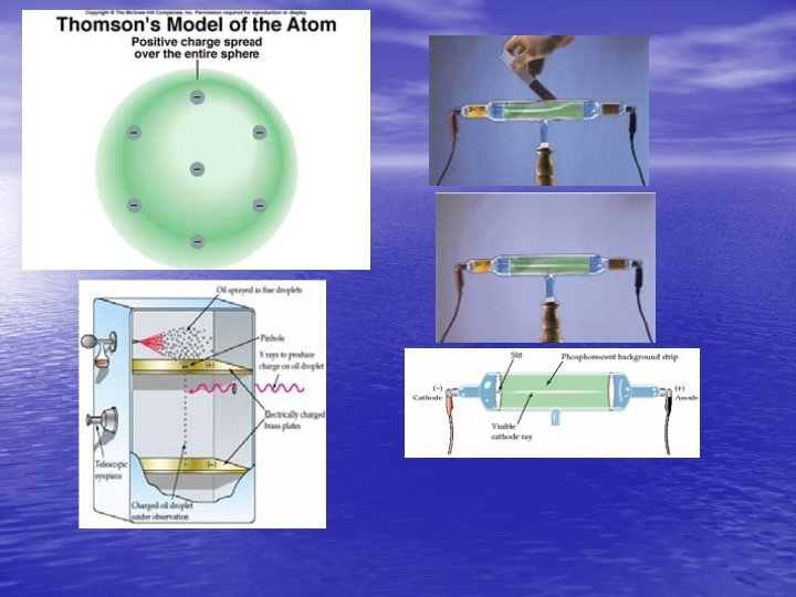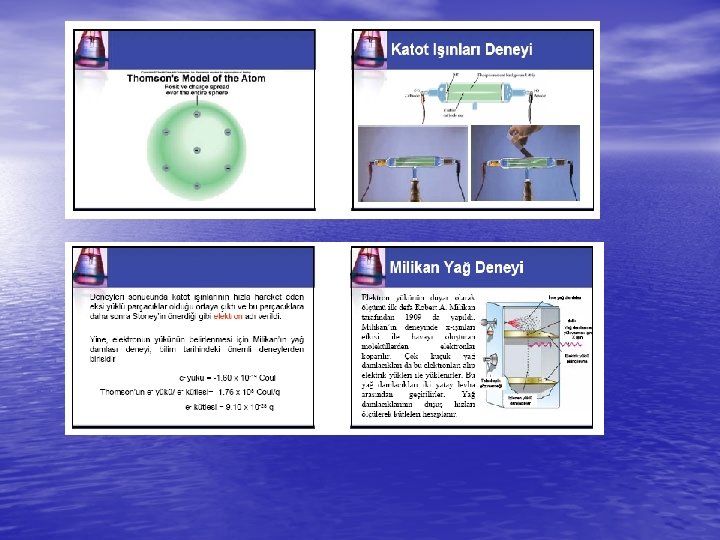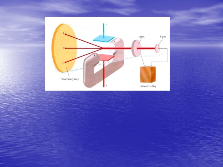 • Thomson deneyinde katot için farklı madde • • • kullandığında ve deney tüpünün farklı gazla doldurulduğunda da katot ışınlarının aynı davranışta bulunduğunu gördü. Böylece elektronun maddenin cinsinin karakteristik bir özelliği olmadığını bütün atom cinsleri için elektronun her birinin aynı olduğunu neticesini ortaya koydu. Elektron negatif yüklü olduğundan elektriksel alanda pozitif kutba doğru saparlar. Elektriksel alandaki bu sapmalar taneciğin yükü (e)ile doğru, kütlesi(m) ile ters orantılıdır. Yükün kütleye oranı (e/m) bir elektrik alanı içinde elektronların doğrusal yoldan ne kadar sapacağını gösterir.