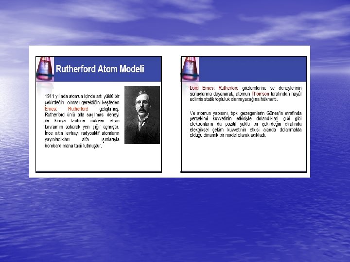 • NOT : • Yeni Zellanda’da doğmuş ve başarılı bir öğrenci • olduğundan 1894 yılında İngiltere’ye gelmiştir. İlk önceleri elektromanyetik radyasyon hakkında çalışmalar yapmıştır. Daha sonraları ilgisini X ışınlarına ve radyoaktiviteye çevirmiştir. Farklı tipte elektromanyetik sembolleri ve ve , radyasyonların varlıklarını ortaya atmış bunlara ilk defa ışımasının ise ışımasının helyum çekirdeği, isimlerini vermiştir. Devamla elektron içerdiğini bulmuş ve bu çalışmasından dolayı 1908 yılında kimya Nobel ödülü almıştır. 1911 yılında atomun kütlesinin çoğunu içine alan çok küçük bir merkezinin olduğunu ortaya attı ve buna çekirdek adını verdi.