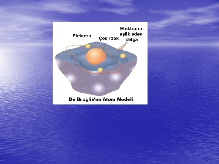 De Broglie Atom Teorisi : • • Bohr’ın atom modeli elektronların yörüngeler arası geçişlerinin mümkün kılan“enerji ( kuantum ) sıçramalarını “ açıklamakta yetersiz kalmaktaydı. Bunun çözümü Fransız fizikçi Prens Victor De Broglie tarafından teklif edilmişti. De Broglie bilinen bazı taneciklerin uygun koşullar altında tıpkı elektromanyetik radyasyonlar gibi bazen de elektromanyetik radyasyonlara uygun şartlarda tıpkı birer tanecik gibi davrana bileceklerini düşünerek elektronlara bir sanal dalganın eşlik ettiğini öne sürerek bir model teklif etti. Bu modele göre farklı elektron yörüngeleri çekirdeğin etrafında kapalı dalga halkaları oluşturmaktaydı.