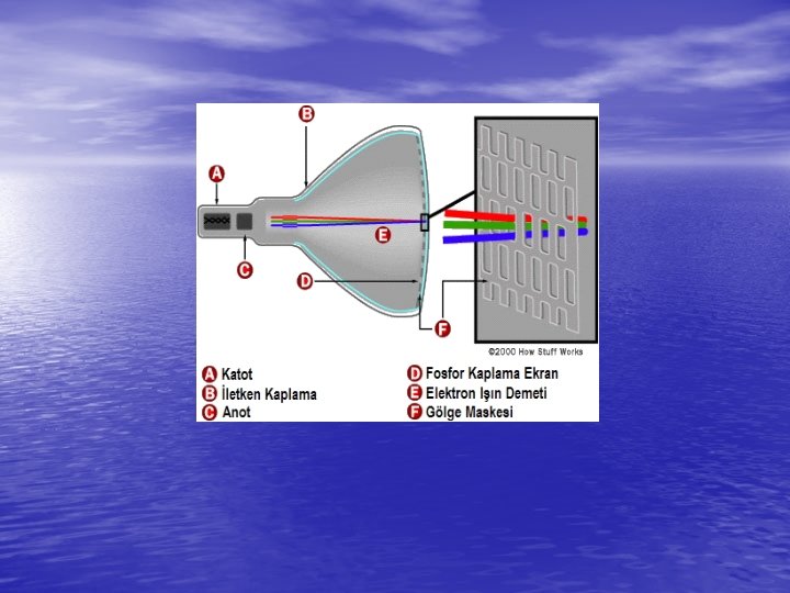 • CRT ekranlar koni şeklindedir. Koninin dar ve sivri ucunda elektron tabancası bulunur. Koninin genişleyen ağzı dikdörtgen şeklini alır ve bu kısım fosfor tabakasıyla kaplıdır. Anot ve katot olarak adlandırılan terimler elektronikte artı(+) ve eksi(-) kutupları ifade eder. Bir pili örnek alacak olursak, artı uç anot, eksi uç katot olur. CRT ekranlarda katot, elektron tabancası içerisinde ısınmış bir filaman(ince tel) şeklinde yer alır.