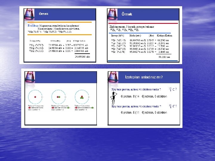 • İzotop atom: Proton sayıları (atom numaraları)aynı, nötron sayıları farklı olan atomlara denir. İzotop atomların kimyasal özellikleri aynı (p aynı) , fiziksel özellikleri farklıdır (n farklı). Nötr halde bulunmayan, iyon halindeki izotop atomların hem fiziksel, hem kimyasal özellikleri farklıdır.
