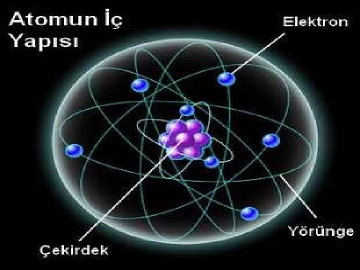 • d) Rutherford Atom Modeli (Ernest Rutherford 1871– 1937) : Atomun çekirdeğini ve çekirdekle ilgili birçok özelliğin ilk defa keşfeden bir bilim adamı Rutherforddur. • Atom kütlesinin tamamına yakını merkezde toplanır, bu merkeze çekirdek denir. • Atomdaki pozitif yüklere proton denir. • Elektronlar çekirdek etrafında gezegenlerin Güneş etrafında dolandığı gibi dairesel yörüngelerde sürekli dolanırlar. Çekirdekle elektronlar arasında çekim kuvveti olduğu için elektronların çekirdeğe düşmemeleri için dolanmaları gerekir. (Yörünge daire şeklinde değil, enerji seviyesine karşılık gelen orbitallerde dolanır). • Elektronların bulunduğu hacim çekirdeğin hacminden çok büyüktür. • Çekirdekteki protonların sayısı (yük miktarı) bir maddenin bütün atomlarında aynı, fakat farklı maddenin atomlarında farklıdır. • Çekirdekteki proton (yük) sayısı, elektron sayısına eşittir. • Çekirdekteki pozitif yüklerin kütlesi yaklaşık atom kütlesinin yarısına eşittir.