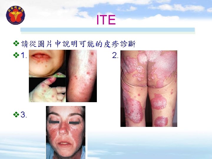 Erythema Multiforme v Drug intake (i. e. , sulfa, phenytoin, penicillin); herpes simplex virus or Mycoplasma pneumoniae infection, etc. v Target lesions (central erythema surrounded by area of clearing and another rim of erythema) up to 2 cm; symmetric on knees, elbows, palms, soles; may become diffuse; may involve mucosal surfaces; lifethreatening in maximal form (Stevens -Johnson syndrome).