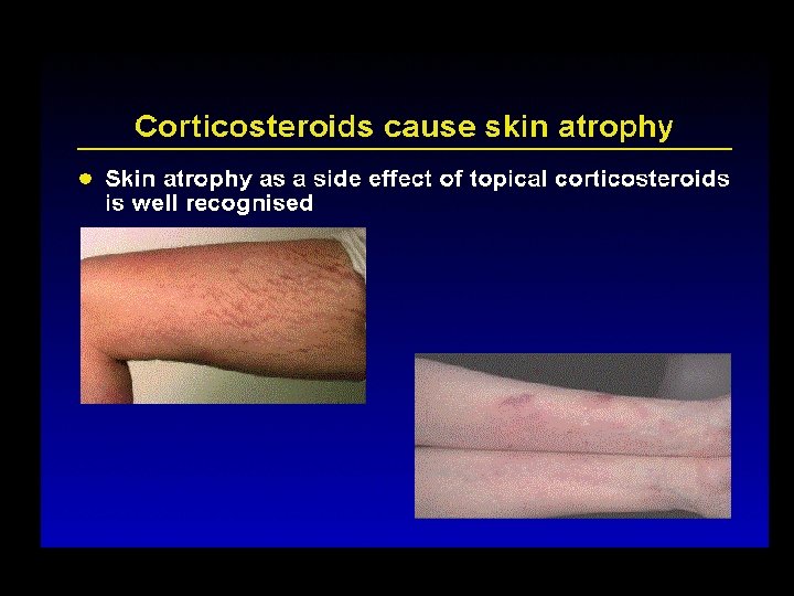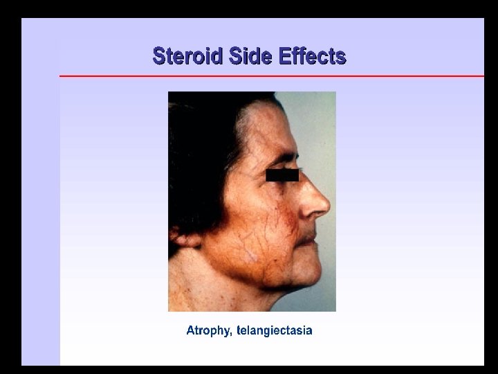 Steroid side effects - local • • Skin atrophy Telangiectasiae Acne Pigmentaion change ALL MORE MARKED IN FLEXURAL SITES!