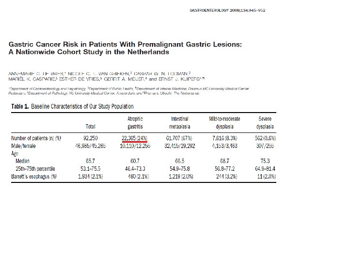 Atrofik gastritte kanser gelişme oranı: 0. 1%/yıl Risk faktörleri: premalign gastrik lezyonun şiddeti , ileri yaş: (75– 84 yaş için, HR: 3. 75) Kadın cins HR: 1. 50,