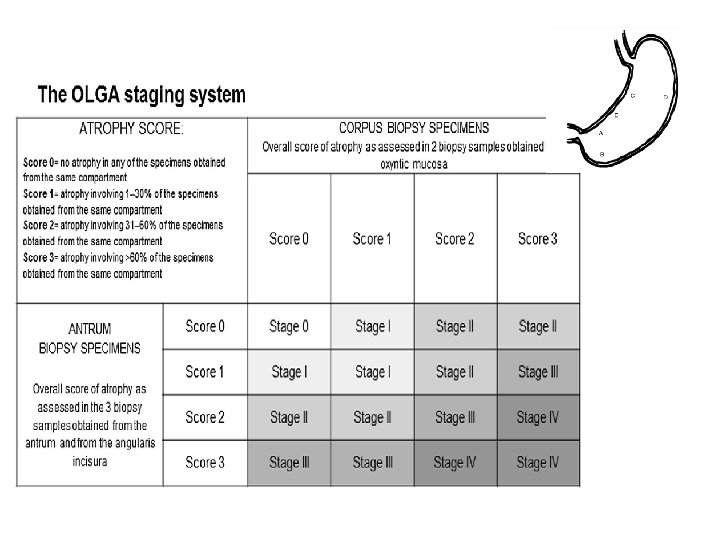 • Risk faktörleri: – Yaş > 50 – Pernisiyöz anemi – Atrofinin şiddeti – Hastalık süresi – Aile öyküsü • OLGA histolojik evreleme sistemi