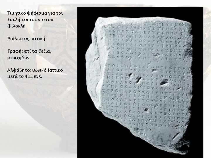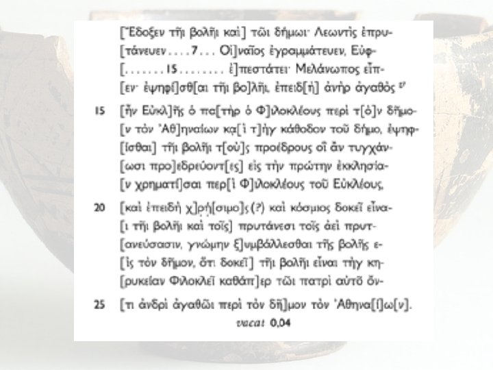 Att stoich 36 403 2 IG II2 Att Slides: 8 Download presentation Att. stoich. 36 403ƒ 2 IG II(2) Att 145. 1 [eÃdocen th=i boulh=i: ¹Ere]xqhiì+j e)[pr]uta/neun, !! !717!8 euj e)gramma/teuen, Simi¿? [!716!7 e]uj e)pesta/te: Eu)rippi¿dh [j eiåpen: eiånai pro/sod]on Eu)kleiÍ a)ndragaqi¿aj [eÀneka kaiì proqumi¿aj], e)peidh a)nhr a)gaqoj e)ge/ [neto periì ton dh=mon t]on ¹Aqhnai¿wn kaiì thg ka/q [odon tou= dh/mo tou= ¹Aqhn]ai¿wn kaiì thn e)leuqeri¿ [an: khrukeu/en d' au)ton t]h=i bolh=i kaiì tw½i dh/mw[i] [tw½i ¹Aqhnai¿wn. thn de mi]sqofori¿an eiånai au)tw½ [i ® ®]. [eÃdocen th=i bolh=i kaiì] tw½i dh/mwi: Lewntiìj e)pru [ta/neuen !37!3 Oi¹]naiÍoj e)gramma/teuen, Eu)f [!615!7 e)]pesta/tei: Mela/nwpoj eiåp [en: e)yhfi¿sqai th=i bo]lh=i, e)peid[h] a)nhr a)gaqoj v [e)ge/neto o( pathr to= Fi]lokle/ouj periì t[o]n dh=mo [n ton ¹Aqhnai¿wn kaiì t]hg ka/qodon tou= dh/mo, e)yhf [i¿sqai th=i bolh=i tou]j proe/drouj oiá aÄn tugxa/n [wsi proedreu/ontej] ei¹j thn prw¯thn e)kklhsi¿a [n xrhmati¿sai periì F]ilokle/ouj tou= Eu)kle/ouj, [kaiì e)peidh xrh/simo]j kaiì ko/smioj dokeiÍ eiåna [i th=i bolh=i kaiì toiÍj] pruta/nesi toiÍj a)eiì prut [aneu/sasin, gnw¯mhn c]umba/llesqai th=j bolh=j e [i¹j ton dh=mon, oÀti dokeiÍ] th=i bolh=i eiånai thg kh [rukei¿an FilokleiÍ kaqa/p]er tw½i patriì au)to= oÃn [ti a)ndriì a)gaqw½i periì ton dh=]mon ton ¹Aqhna[i¿]w[n]. vacat 0. 04