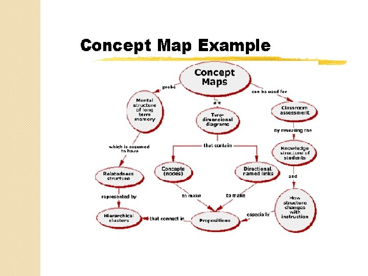 Concept mapping can provide: �The big picture �A graphic for the knowledge to be learned �A tool to link new knowledge to prior knowledge and experience �An assessment tool �A gauge of student understanding �A method to identify misconceptions