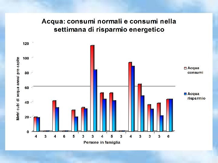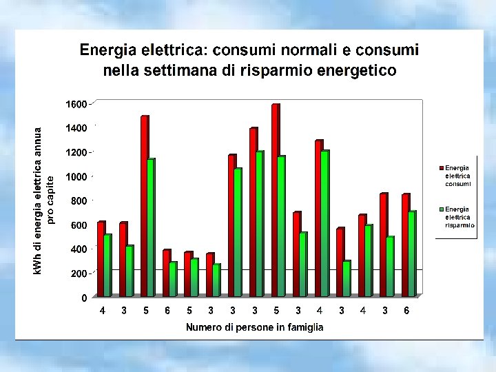 Differenze di consumi dovute a: • tipologia degli alloggi • localizzazione (lontana o vicina i luoghi di studio e lavoro), • numero di persone in famiglia. Obiettivo centrato: tutti sono riusciti ad attuare un programma di risparmio.