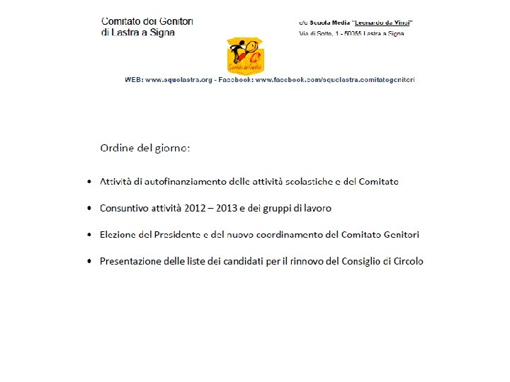 GRUPPO MENSA ü ULTERIORI AZIONI CON L’AMMINISTRAZIONE COMUNALE PER OTTENERE MAGGIORI BENEFICI ECONOMICI SOPRATTUTTO PER LE FAMIGLIE PIU’ DEBOLI ü PORTARE A COMPLETA DEFINIZIONE IL REGOLAMENTO COMUNALE PER IL SERVIZIO DI REFEZIONE SCOLASTICA ü PUNTARE L’ATTENZIONE SULLA QUALITA’ DEI PRODOTTI UTILIZZATI DAL CENTRO COTTURA PER LA PRODUZIONE DEI CIBI GRUPPO LAVORI/SICUREZZA ü PROCEDERE ALLA INDIVIDUAZIONE DI NUOVI REFERENTI PRESSO I PLESSI SCOLASTICI DEL TERRITORIO ü ATTIVARE UN CANALE DI COMUNICAZIONE PIU’ DINAMICO E VELOCE PER LA GESTIONE DEI LAVORI CON L’ASSESSORATO COMPETENTE E IL PERSONALE SCOLASTICO