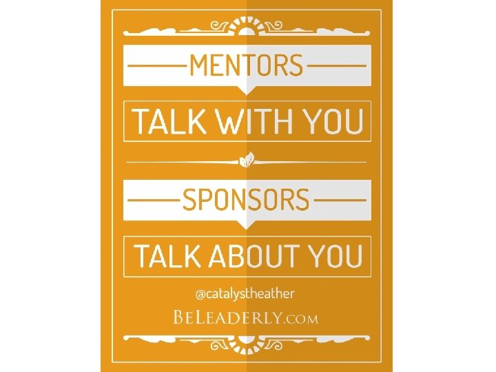 What a sponsor does What you must do 1. Believes in you, understands and values that you can be a leader, and is willing to take a bet on you. 1. Exceeds expectations, and make your performance known. 2. Is prepared to go out on a limb for you and publicly support you. 2. Demonstrates that you are trustworthy and loyal. 3. Is in your corner and gives you “air cover”. 3. Brings something special and unique to the table. Sylvia Ann Hewlett, quoted in “Why You Need A Sponsor — Not A Mentor — To Fast-Track Your Career, ” by Jenna Goudreau, Business Insider.