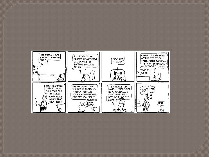 Cognitive Dissonance: � Cognitive dissonance theory suggests that we have an inner drive to hold all our attitudes and beliefs in harmony and avoid disharmony (dissonance) � Example: You don’t like to lie but you are forced to lie for a friend � In order to avoid this, some people adapt by changing their attitude, the behavior, or creating a new cognition.