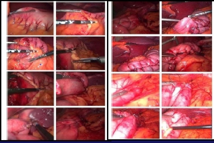 Technique Gastric plication • dissection of angle of His, liberation of the greater gastric curvature with a radio frequency. Enfolding of the gastric wall performed on the greater curvature (comprising body and antrum) and performing a double row of extramucosal sutures from top to bottom. A bougie 32 -FR or a gastrocope is usually placed by the anesthesia team into the lumen of the stomach. Sleeve gastrectomy • was described by Gagner: it consists in reducing the stomach into a vertical tube with a volume of about 100 ml or less achieved through resection of the greater curvature following a line parallel to the lesser curvature using a linear stapler. A bougie of caliber 32 -FR is usually placed by the anesthesia team into the lumen of the stomach along the lesser curvature. A test with methylene blue is used for controlling the sealing of the suture line.