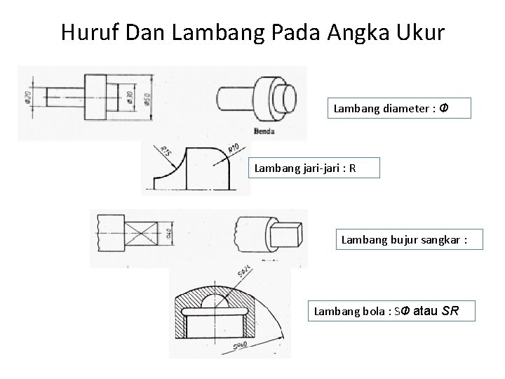 Huruf Dan Lambang Pada Angka Ukur Lambang diameter : Ф Lambang jari-jari : R Lambang bujur sangkar : Lambang bola : SФ atau SR