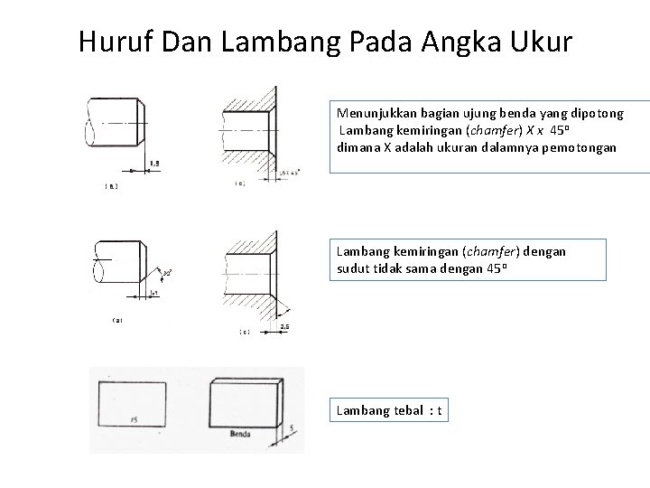 Huruf Dan Lambang Pada Angka Ukur Menunjukkan bagian ujung benda yang dipotong Lambang kemiringan (chamfer) X x 45 o dimana X adalah ukuran dalamnya pemotongan Lambang kemiringan (chamfer) dengan sudut tidak sama dengan 45 o Lambang tebal : t