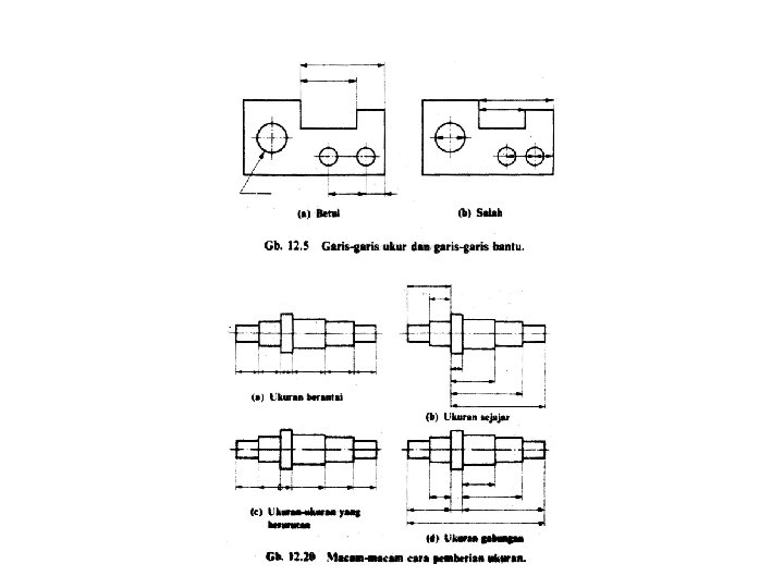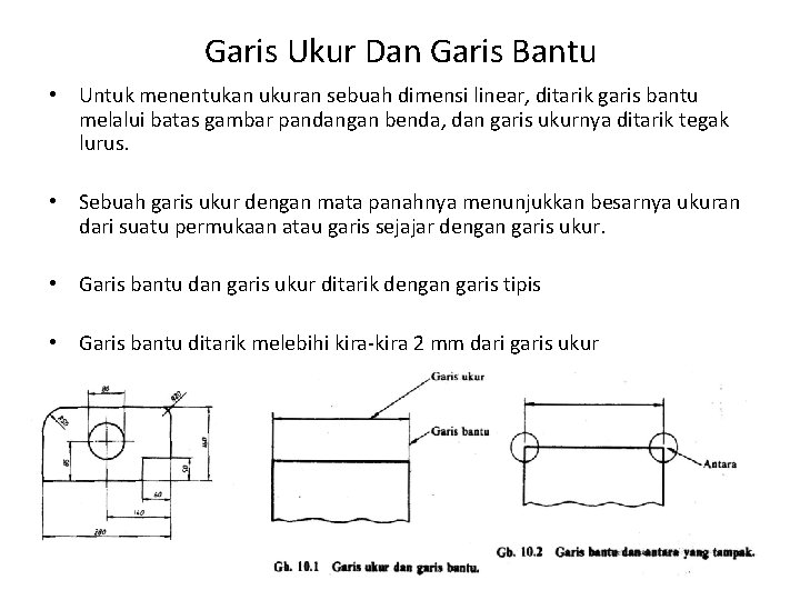 Garis Ukur Dan Garis Bantu • Untuk menentukan ukuran sebuah dimensi linear, ditarik garis bantu melalui batas gambar pandangan benda, dan garis ukurnya ditarik tegak lurus. • Sebuah garis ukur dengan mata panahnya menunjukkan besarnya ukuran dari suatu permukaan atau garis sejajar dengan garis ukur. • Garis bantu dan garis ukur ditarik dengan garis tipis • Garis bantu ditarik melebihi kira-kira 2 mm dari garis ukur