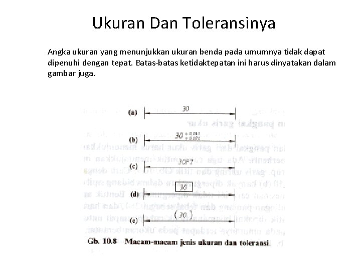 Ukuran Dan Toleransinya Angka ukuran yang menunjukkan ukuran benda pada umumnya tidak dapat dipenuhi dengan tepat. Batas-batas ketidaktepatan ini harus dinyatakan dalam gambar juga.