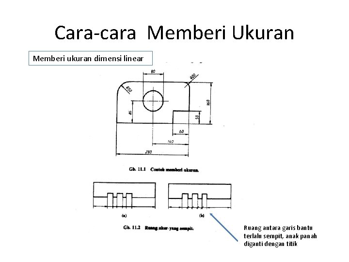 Cara-cara Memberi Ukuran Memberi ukuran dimensi linear Ruang antara garis bantu terlalu sempit, anak panah diganti dengan titik