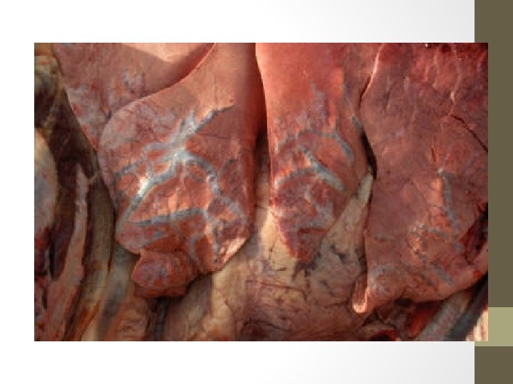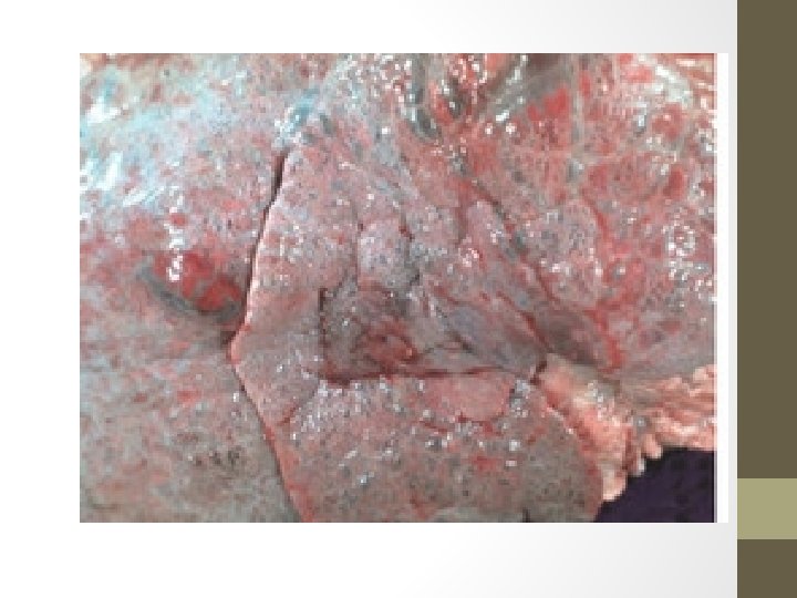 Pathology • Inflammation and widening of the connective tissue of the lungs. • Widened septae • Usually not a lot of fibrin and adhesions • Failure of lungs to collapse easily • May see large trapped air pockets (bulla) as well as smaller gas bubbles in septae (emphysema) • Lungs are heavy and sometimes “wet” • The most affected areas are in the dorsal or higher portion of the lung • The lower lung may be consolidated (no air) due to secondary bacterial infection