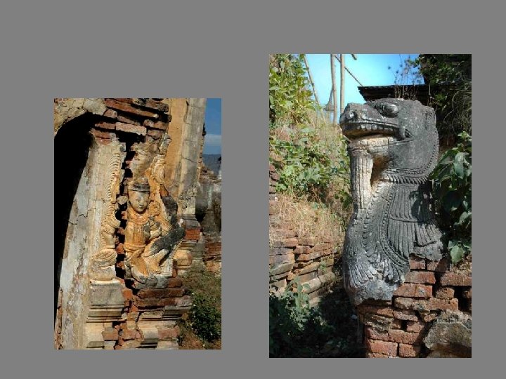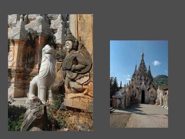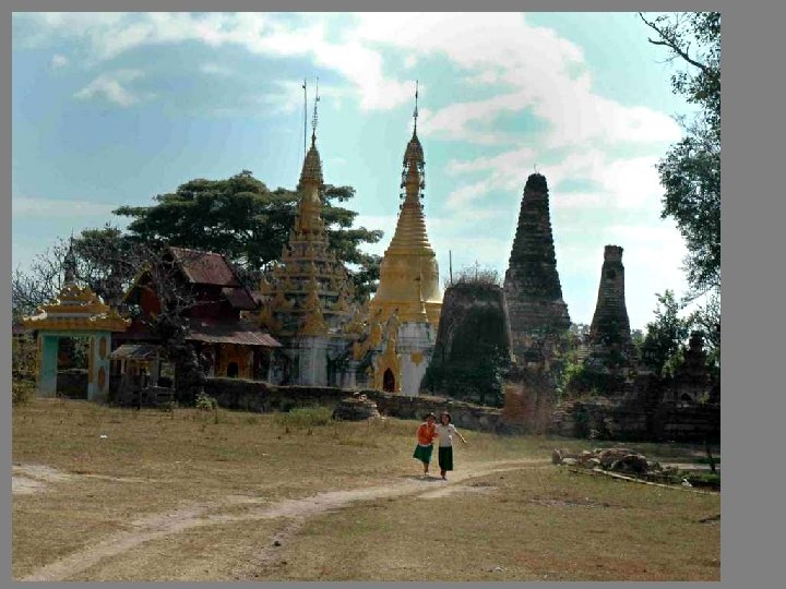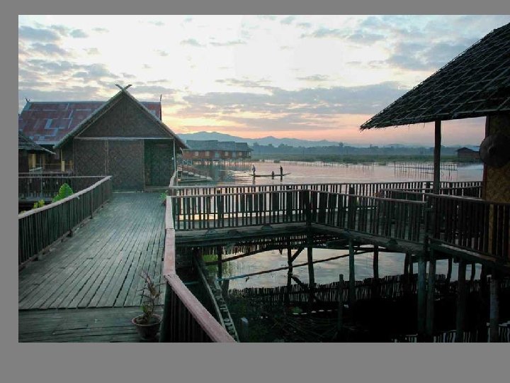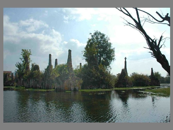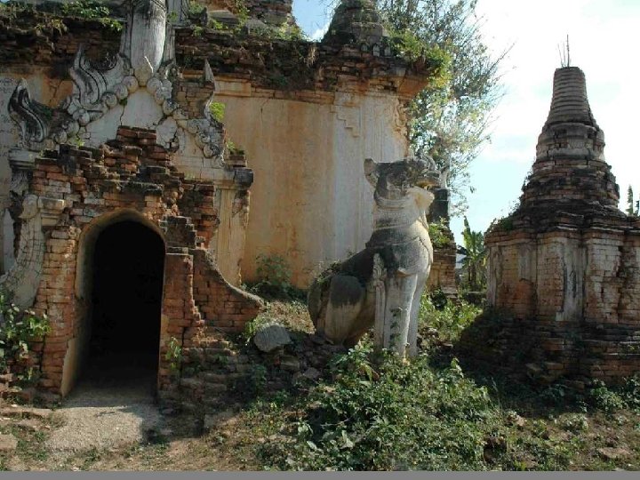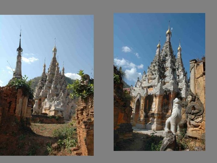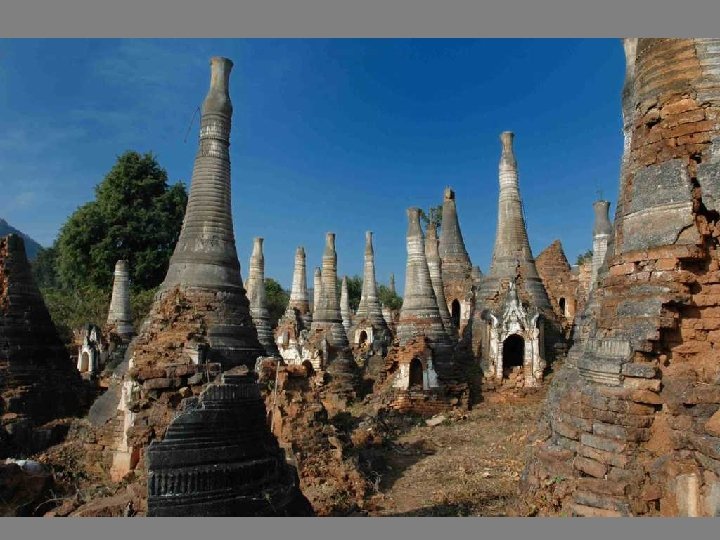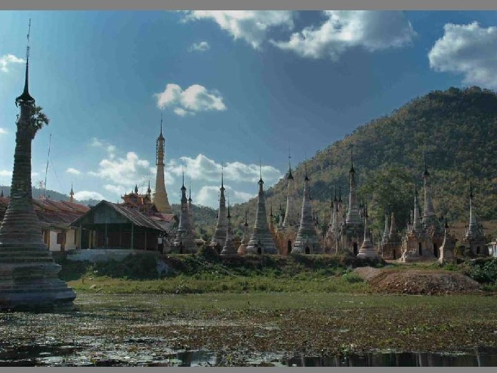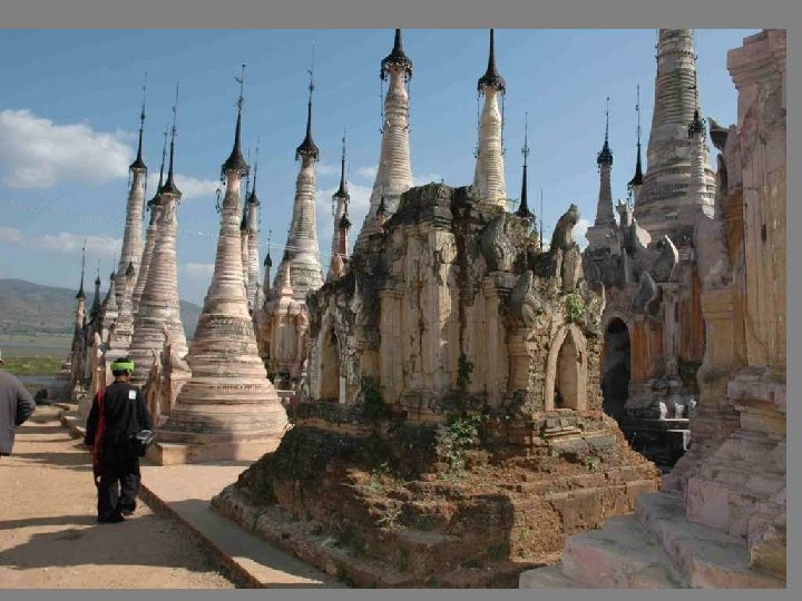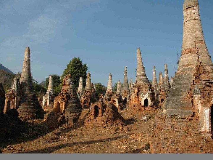 • Le lac Inlé , au sud de l’état Shan, fait une cinquantaine de km. Habité par les Intha (fils du lac). Environ 100 000 personnes vivent sur la côte et des villages ainsi que des jardins flottants. Les Paos, un autre peuple Shan, occupent la périphérie et un autre lac plus au sud: nul ne peut y pénétrer sans leur autorisation et accompagnement. • Le site d’Indei, longtemps interdit aux étrangers, est en fait une territoire de 1000 stupas endormis dans la végétation: émouvants, on se prend a errer en pensant à hier, c’est-à-dire à il y a 500 ans, dans ces lieux où on croit entendre les chants d’un peuple d’ombres qui vous accompagnent invisiblement… • Rien n’a bougé depuis………. . .