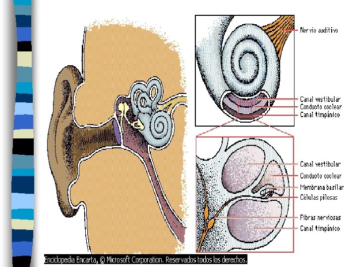 Oído Interno En resumen el oído interno cumple con las siguientes funciones: n a- Transducción mecano eléctrica: Convierte la energía mecánica vibratoria en eléctrica n b- Análisis preliminar del sonido. Antes del análisis final en el cerebro, el sonido ya es discriminado por lo menos en dos parámetros: Intensidad (La frecuencia de los potenciales de acción generados aumenta con la intensidad) y la altura Tonal) El tono percibido depende del sector de la membrana basilar excitado n