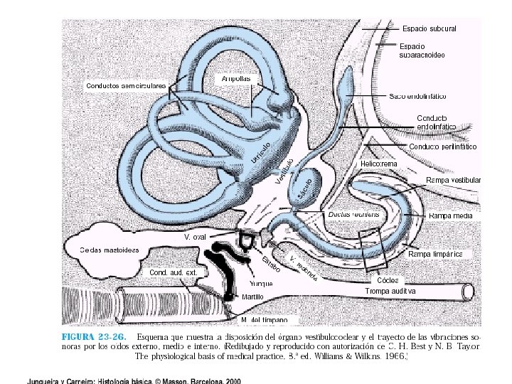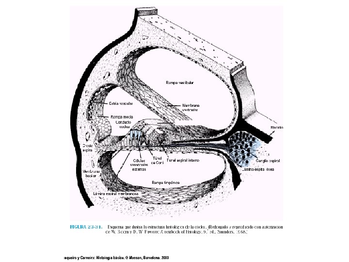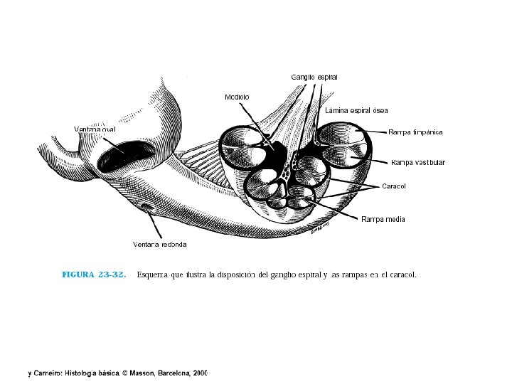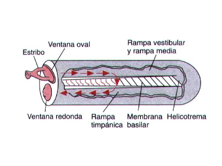 n n n Membrana o Lámina Basilar Separa la rampa timpánica y el conducto coclear se encuentra el órgano de Corti (células ciliadas). Es fibrosa y contiene de 20 a 30 mil fibras basilares con una base fija en el mediolo o columela y vértice libre Las fibras basilares son de mayor long. y menor diámetro hacia el helicotrema. Onda sonora al desplazar hacia adentro la ventana oval empuja a la lamina basilar que por tensión elástica las fibras basilares desplazan la onda de liquido por la lamina basilar.