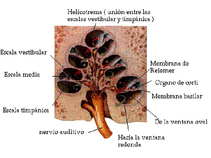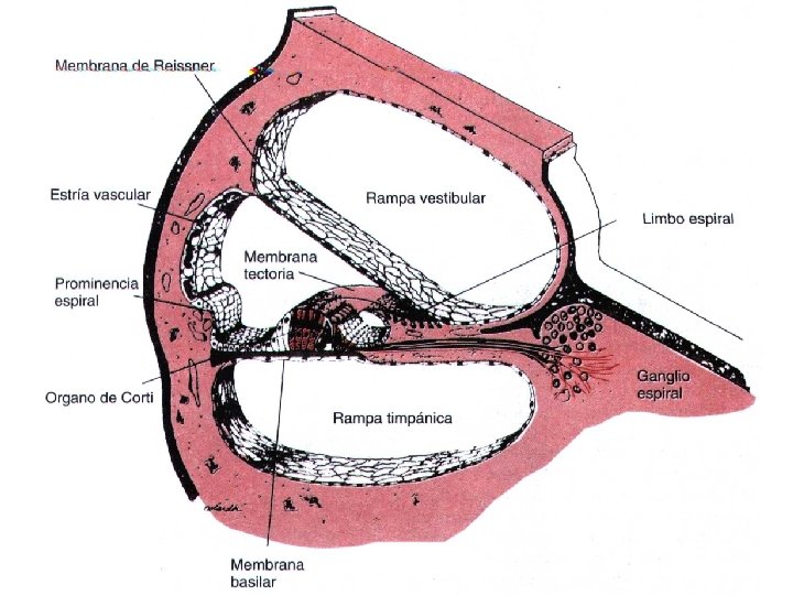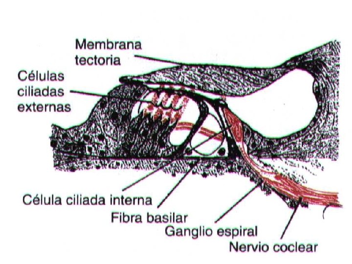 Órgano de Corti órgano receptor de las vibraciones de la lamina basilar que genera impulsos nerviosos. n Las células sensitivas receptoras del órgano de Corti son células ciliadas externas e internas, estas hacen sinapsis (base) con red de terminaciones nerviosas cocleares-G espiral de Corti-Nervio coclear. n Por el movimiento de ascendente y descendente de la fibra basilar por la vibración hacen que toquen las cilios contra la membrana tectónica. n
