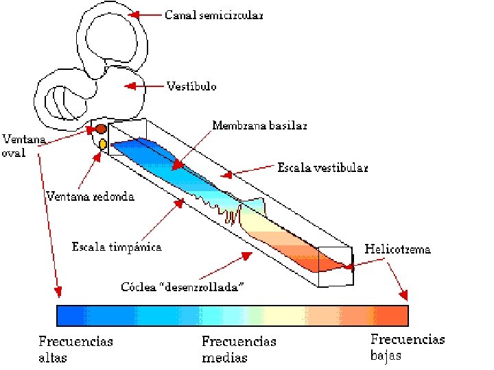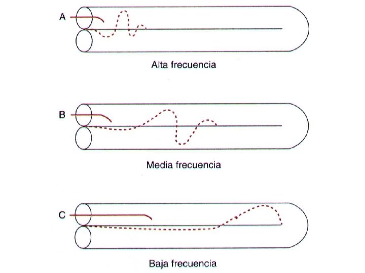 Cada onda sonora es débil pero se refuerzan cuando alcanzan la porción de la lamina basilar de una frecuencia de resonancia igual y la energía de la onda se disipa. n Onda sonora de alta frecuencia son distancia corta (base) fibras basilares cortas y rígidas en la lamina basilar n Onda sonora de baja frecuencia son mayor longitud (helicotrema) fibras basilares largas y flexibles en la lamina basilar. n Patrón de amplitud de la vibración n