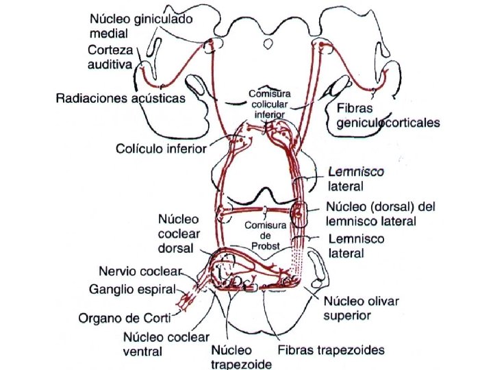n VIAS NERVIOSAS AUDITIVAS. n Ganglio espiral de Corti n N cocleares dorsal y ventral (bulbo)--n N olivar superior(protuberancia) lemnisco lateral. n Núcleo del lemnisco lateral(protub. )--Coliculo inferior--n N geniculado medial- radiacion auditiva n Corteza auditiva.