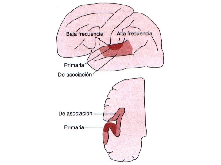 Corteza cerebral auditiva n Circunvolución temporal y cara lateral del lóbulo temporal. n Corteza auditiva primaria y secundaria o de asociación. n Distinguen frecuencias en zonas especificas -mapas tonotopicos: anterior baja frecuencia-posterior: alta frecuencia, etc. ( corteza primaria) n Otros: identifican tonos, dirección del sonido, modulaciones, sonidos bruscos, etc.