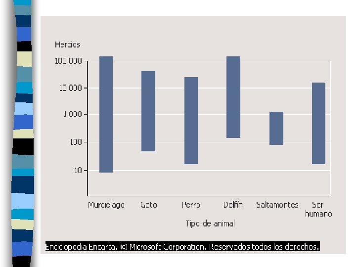 Intensidad La intensidad fisiológica o sensación sonora de un sonido se mide en decibelios (d. B). n Por ejemplo, el umbral de la audición está en 0 d. B, la intensidad fisiológica de un susurro corresponde a unos 10 d. B y el ruido de las olas en la costa a unos 40 d. B. n La escala de sensación sonora es logarítmica, lo que significa que un aumento de 10 d. B corresponde a una intensidad 10 veces mayor: por ejemplo, el ruido de las olas en la costa es 1. 000 veces más intenso que un susurro, lo que equivale a un aumento de 30 d. B. n