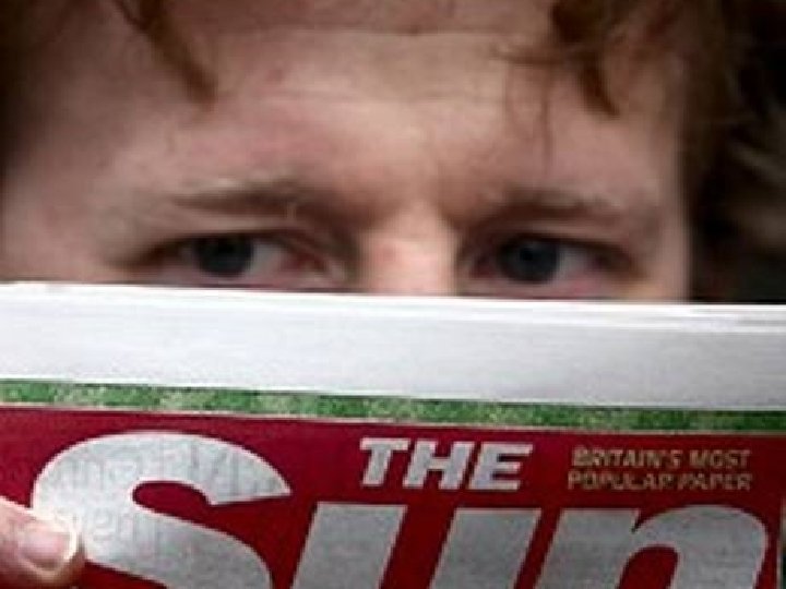 The Sun’s Target Audience • Male - heavy coverage of sport, particularly football; page 3 and other “sexist” portrayals of women). There is some content that is ‘woman friendly’ (celebrity content). • 16+ - simplistic coverage, celebrity content, titillating stories. • White British– possible negative representations of ethnic minorities, xenophobic? or nationalistic attitude? Patriotic stories. • Working Class/C 2 DE – price (40 p), very little serious political coverage, focus on show business/sensational stories, 20%of the paper about sport with an emphasis on football, the size is convenient. • Fairly right wing political views (political content). • Value and Attitudes: ‘Mainstreamers’, ‘Strugglers’ and ‘Resigned’. Illustrated through advertising.