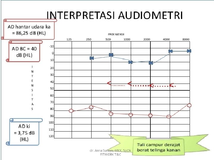 Audiogram Tahun ke-3 Umur Jenis Pengujian Threshold Telinga Kanan (d. B) Pada berbagai frekuensi (k. Hz) STS Average 0, 5 1 2 3 4 8 23 Awal 5 5 10 15 15 15 13, 3 25 Tahunan 0 5 5 10 10 15 8, 3 Secara Umum, hasil audiometric test setelah 2 tahun dalam keadaan masih sehat. Perbaikan batas pendengaran terlihat pada frekuensi 0, 5, 2, 3, 4 k. Hz, jika dibandingkan dengan baseline. Perubahan STS pada baseline yaitu -5 d. B (=8, 3 -13, 3 d. B). Angka ini merupakan angka yang cukup signifikan bagi perubahan status baseline (revisi).