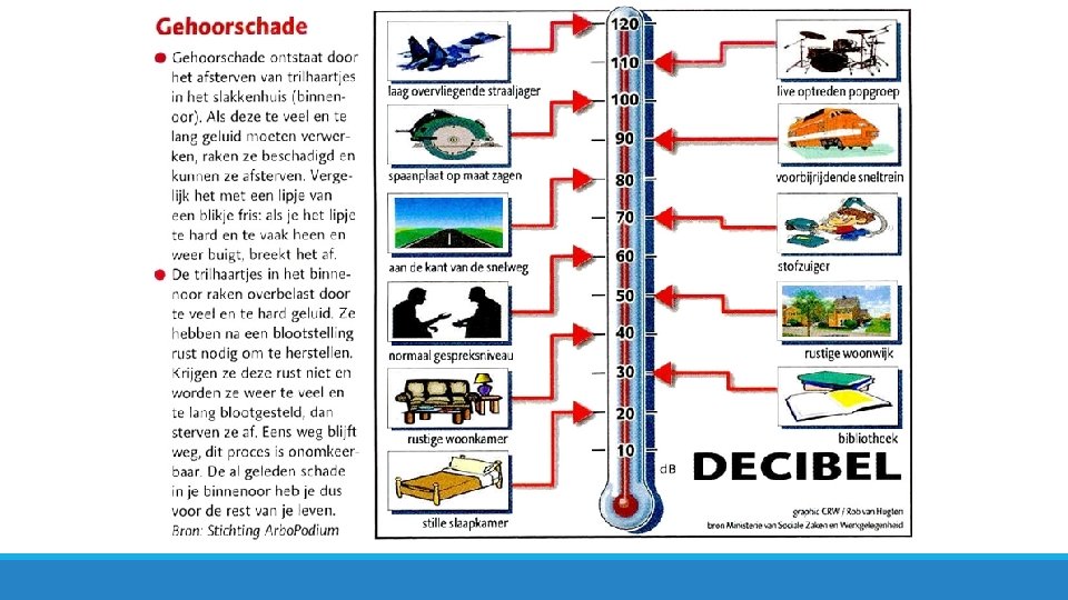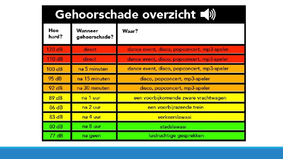 Wat betekent de uitslag? Intensiteit van geluid is decibel (d. B) Mate gehoorverlies Tussen 30 -35 d. B lichte slechthorendheid Tussen 35 -60 d. B matige slechthorendheid Tussen 60 -90 d. B ernstige slechthorendheid Meer dan 90 d. B doofheid