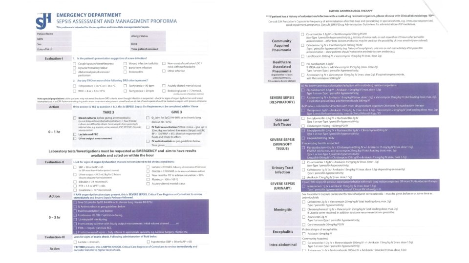 Audit standards • Surviving Sepsis Guidelines • Sepsis 6 bundle to be performed within 1 hour once diagnosis of sepsis is made • Hospital antimicrobial guidelines Sepsis Management National Clinical Guideline No. 6