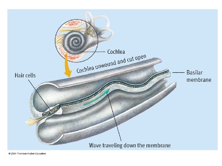 Perceiving Pitch § Place Theory – best explains how we sense high pitches § theory that links the pitch we hear with the place where the cochlea’s membrane is stimulated § Frequency Theory – best explains how we sense low pitches § theory that the rate of nerve impulses traveling up the auditory nerve matches the frequency of a tone, thus enabling us to sense its pitch