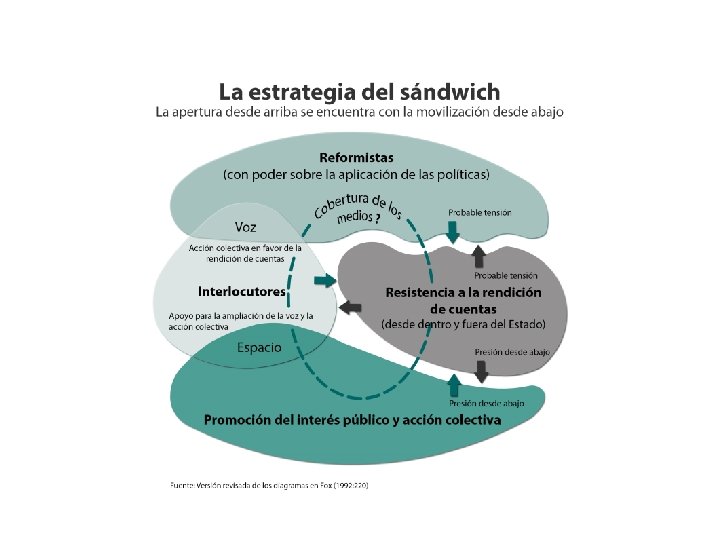 Próximos pasos: invertir en la sinergia Estado-sociedad Teoría del cambio: la construcción de la rendición de cuentas está impulsada por coaliciones de fuerzas pro-rendición de cuentas a ambos lados de la divisoria entre Estado y sociedad y actúan para contrarrestar a fuerzas anti-rendición de cuentas (que también están a ambos lados de la divisoria entre Estado y sociedad). Características claves: - Punto de salida: las fuerzas anti-rendición de cuentas a menudo son más fuertes que las pro-rendición de cuentas. - Esta desequilibrio de poder conduce a “trampas de bajos niveles rendición de cuentas” auto-reforzables. -Punto de entrada: ¿Pueden los reformadores gubernamentales modificar el entorno para la acción colectiva? - De ser así, entonces la acción colectiva y la supervisión de la sociedad civil pueden a su vez empoderar a los reformadores gubernamentales. - Invertir en interlocutores: la creación de puentes dentro del capital social puede alentar la construcción de coaliciones entre actores pro-rendición de cuentas tanto en el Estado como en la sociedad civil. - Negociaciones accesibles y procesos de adjudicación pueden mitigar conflictos. - Conviene suponer que las variaciones a nivel subnacional y el cambio discontinuo son eventos probables. - Este proceso de empoderamiento mutuo también se llama “co-producción” o “co-gobernanza”. La estrategia del sándwich: expresión que se refiere coaliciones coordinadas entre actores pro-rendición de cuentas insertos tanto en el Estado como la sociedad.