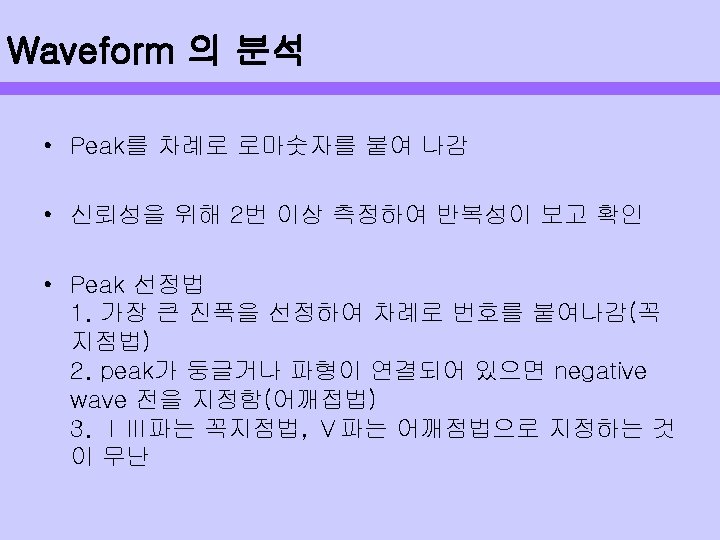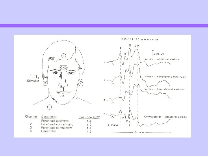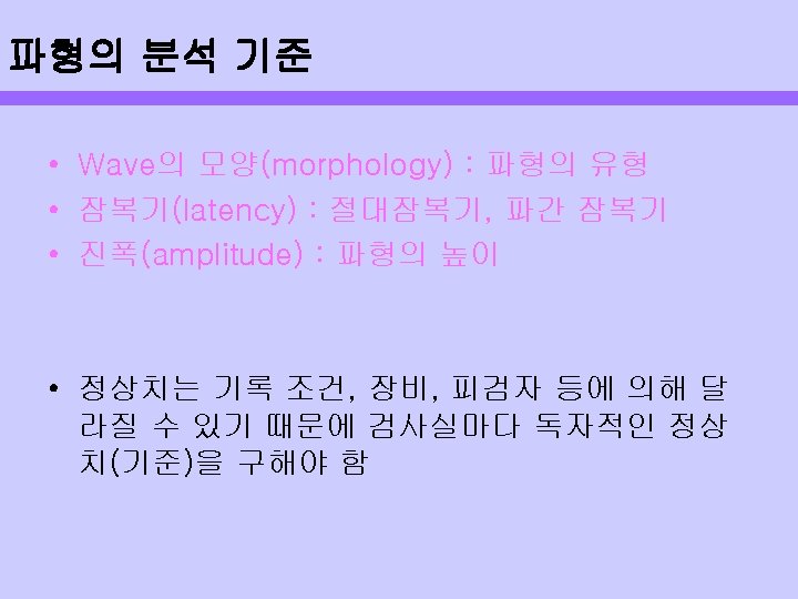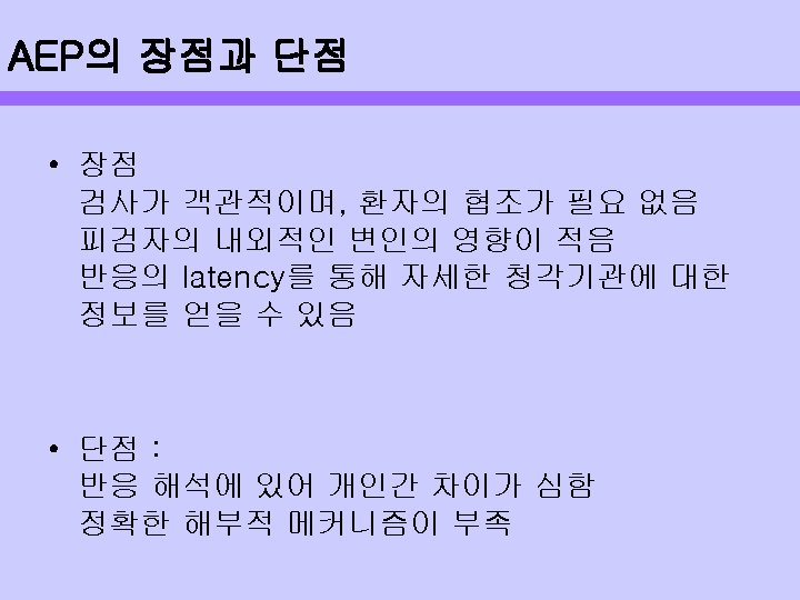 전기생리적인 검사 AEP의 절대 Latency는 자극시작과 wave 반응과의 시간 간격에 의해 결정됨 반응 순서(first, middle, slow, late) Waveform은 peak, trough, wave 구성 Latency-polarity comination Wave는 amplitude, latency 구성 Polarity-order 측정변수는 CANS의 spatial-tomporal 반영 Latency epoch Neural generator Classification of AEP Measurable parameters