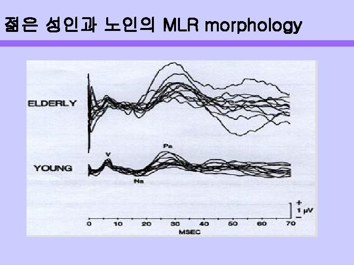 Middle Latency Response: MLR Description Of Response Neural Generators Effects Of Aging • 높은 강도의 음 자극 후 15 -50 ms내의 반응 주요 peak : N, P (Na, Pa, Nb) • • Auditory thalamocortical pathway의 요소로 제시 Pa의 요소 : auditory cortexs 내의 양이 효과로 발생 됨 • Woods and Clayworth(1986) : 노인의 Pa latency가 길어 짐 Azumi, Nakashima and Takahashi(1995) : latency는 중 요한 요인이 아님 amplitude는 말초적 변화보다는 CANS 의 나이와 관련이 있음 •
