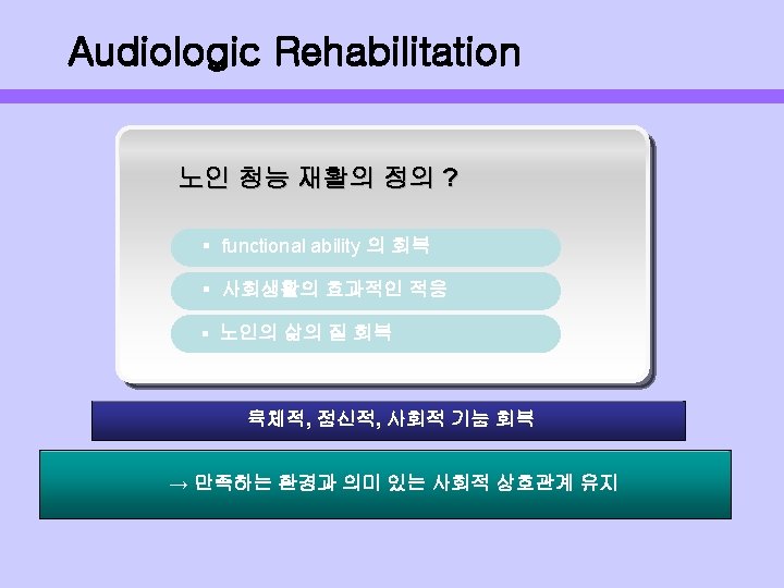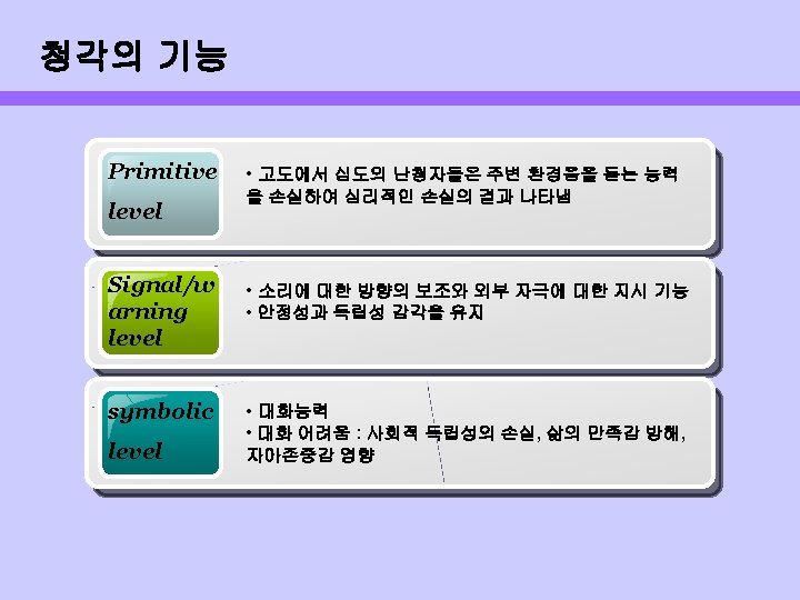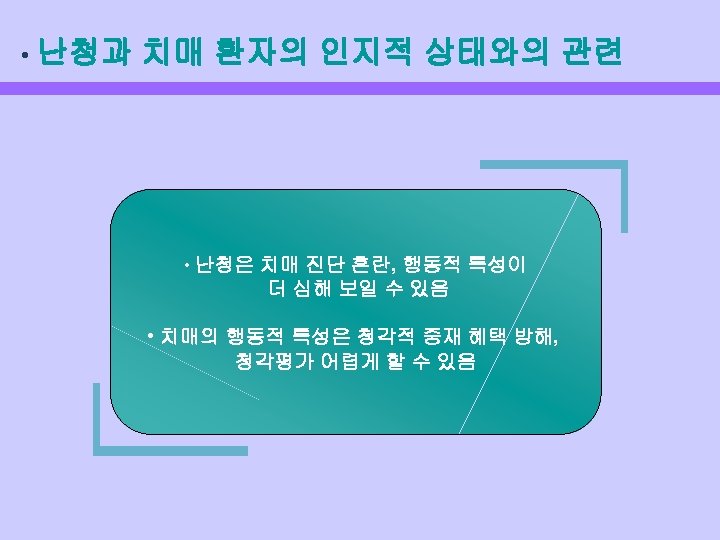 난청의 영향 • • • Negatively impact on communicative behavior Alter psychosocial behavior Strain family relations Limit the enjoyment of daily activities Jeopardize physical well-being Interfere with long distance on the telephone, potentially jeopardizing safety & security • Interfere with the ability to live independently and safely • Interfere with compliance with pharmacologic regiment • Interfere with therapeutic interventions across all disciplines including social work, speech-language therapy, physical or occupational therapy